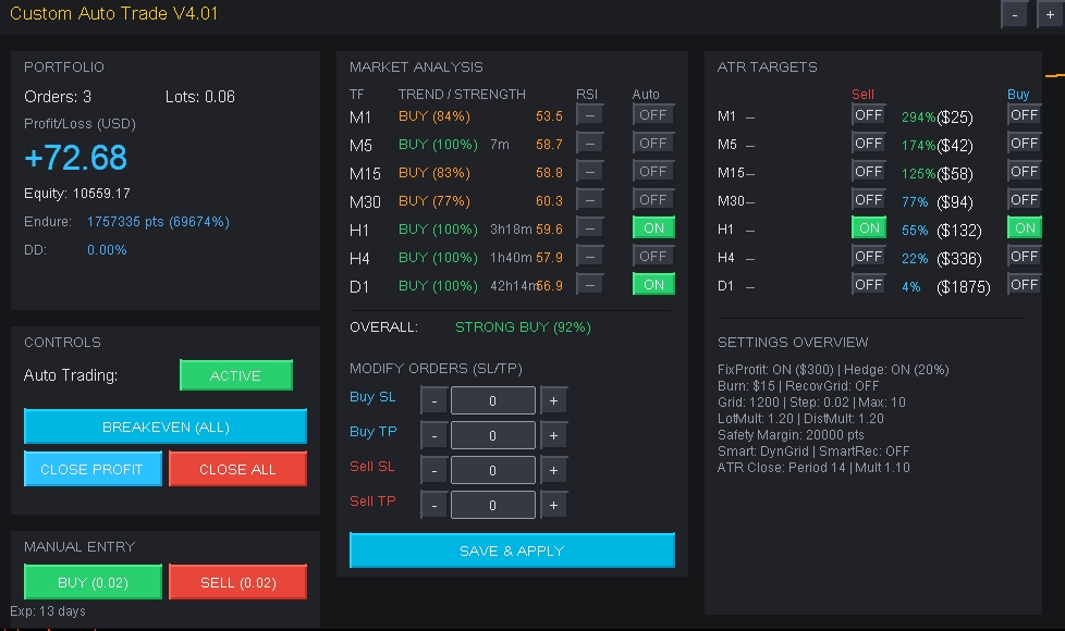 | MANUAL ENTRY (เทรดมือ) | ปุ่ม BUY / SELL สำหรับออกออเดอร์ด้วยตัวเอง *เมื่อกดแล้ว EA จะรับไม้ไปดูแลต่อ (แก้ไม้/ปิดกำไร) ให้ทันที |